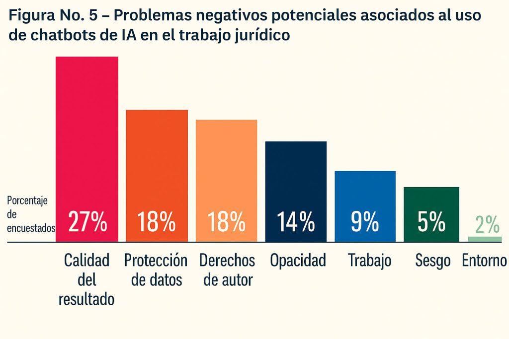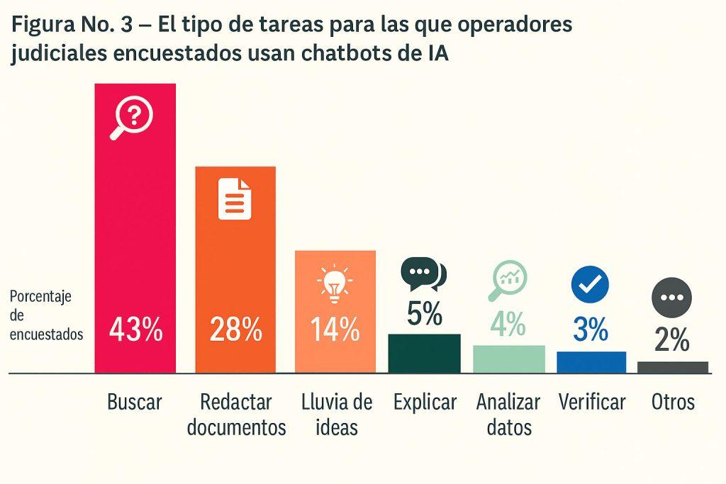 Entre quienes reportaron utilizarlos, el 43 % indicó que los emplea para la búsqueda de legislación, jurisprudencia, doctrina o información técnica; el 28 % para la redacción de documentos —incluidos resúmenes, correos rutinarios, argumentos legales, traducciones y corrección de textos—; y el 14 % para la lluvia de ideas. En menor proporción, el 5 % reportó utilizarlos para clarificar conceptos complejos, el 4 % para analizar datos, el 3 % para verificar información y el 2 % para programación.